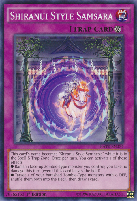 This card's name becomes "Shiranui Style Synthesis" while it is in the Spell & Trap Zone. Once per turn: You can activate 1 of these effects. •Banish 1 face-up Zombie-Type monster you control; you take no damage this turn (even if this card leaves the field). •Target 2 of your banished Zombie-Type monsters with 0 DEF; shuffle them both into the Deck, then draw 1 card.