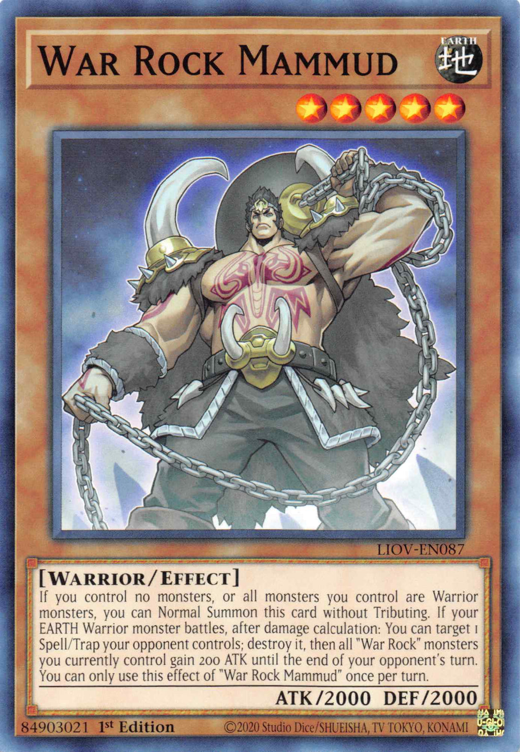 If you control no monsters, or all monsters you control are Warrior monsters, you can Normal Summon this card without Tributing. If your EARTH Warrior monster battles, after damage calculation: You can target 1 Spell/Trap your opponent controls; destroy it, then all "War Rock" monsters you currently control gain 200 ATK until the end of your opponent's turn. You can only use this effect of "War Rock Mammud" once per turn.
