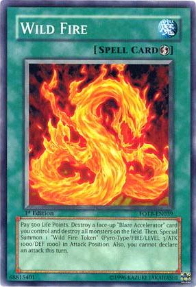 Pay 500 Life Points. Destroy a face-up "Blaze Accelerator" card you control and destroy all monsters on the field. Then, Special Summon 1 "Wild Fire Token" (Pyro-Type/FIRE/LEVEL 3/ATK 1000/DEF 1000) in Attack Position. Also, you cannot declare an attack this turn.